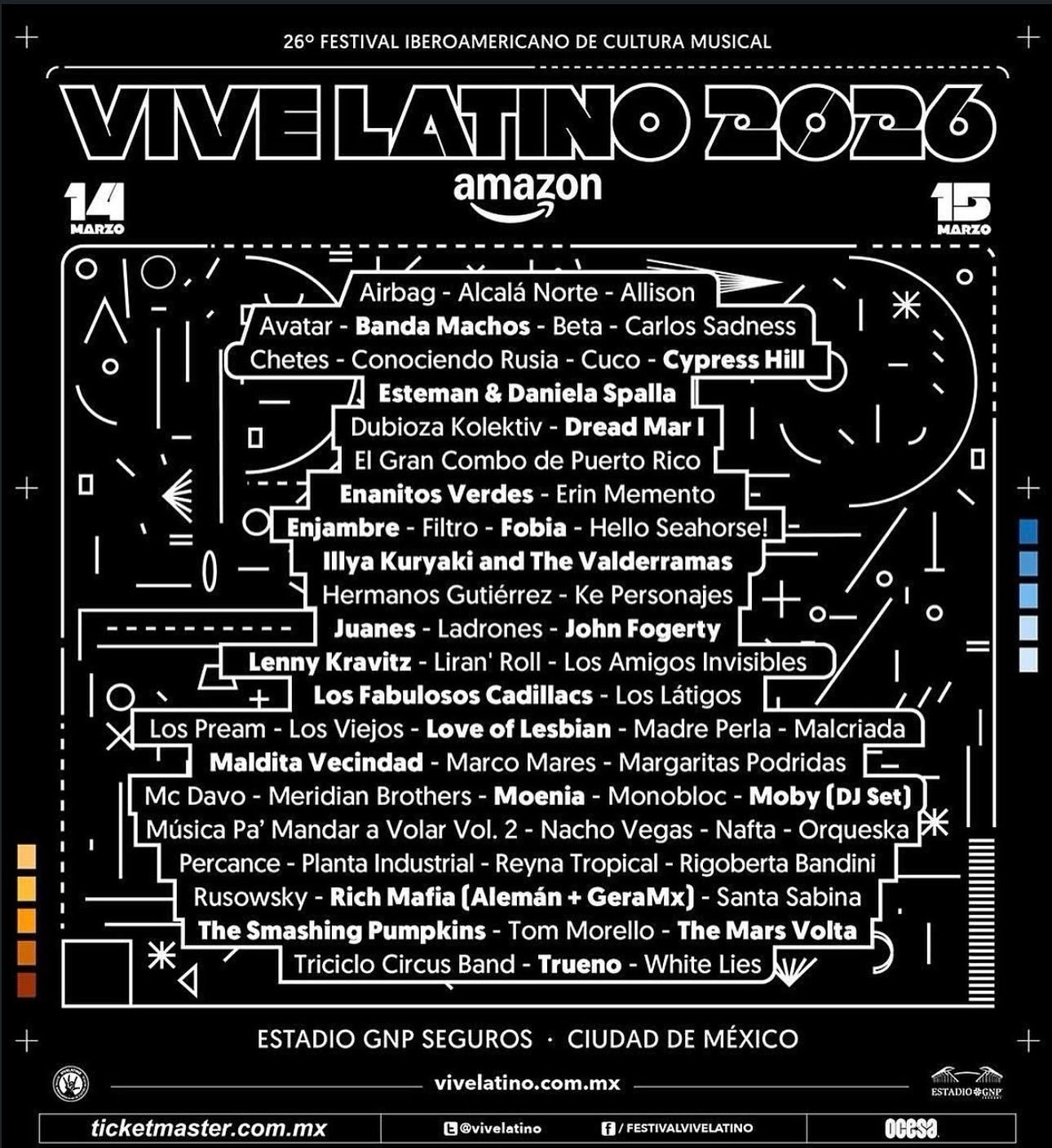 El Festival Iberoamericano de Cultura Musical Vive Latino ha dado a conocer su cartel oficial para la edición 2026, consolidándose nuevamente como un referente de la música iberoamericana. Anunciado el 13 de octubre de 2025 a través de los canales oficiales del evento, el lineup combina iconos del rock alternativo internacional con figuras consolidadas de la música latina y propuestas emergentes, prometiendo una experiencia que abarca desde el rock político hasta la electrónica experimental. Presentada por Amazon Music, esta edición se celebrará los días 14 y 15 de marzo de 2026 en el Estadio GNP Seguros de la Ciudad de México, regresando a la sede que ha sido sede emblemática del festival durante gran parte de su historia.