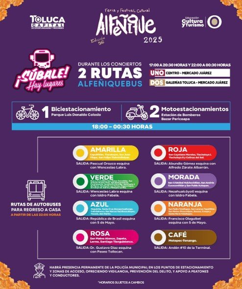Igualmente, Gabriel Medina Peralta, Director General de Planeación, Gestión Urbana y Ciudad Inteligente, detalló que el transporte conectará puntos estratégicos como Paseo Tollocan, Parque Urawua y la avenida Morelos, con paradas claramente señalizadas. Además, se habilitaron rutas nocturnas de transporte público desde el Mercado Juárez hacia colonias y delegaciones, identificadas por colores para facilitar su uso. Entre ellas destacan la amarilla hacia Capultitlán y San Felipe Tlalmimilolpan; la verde hacia Zinacantepec y Metepec; y la rosa hacia Lerma y Santiago Tianguistenco.