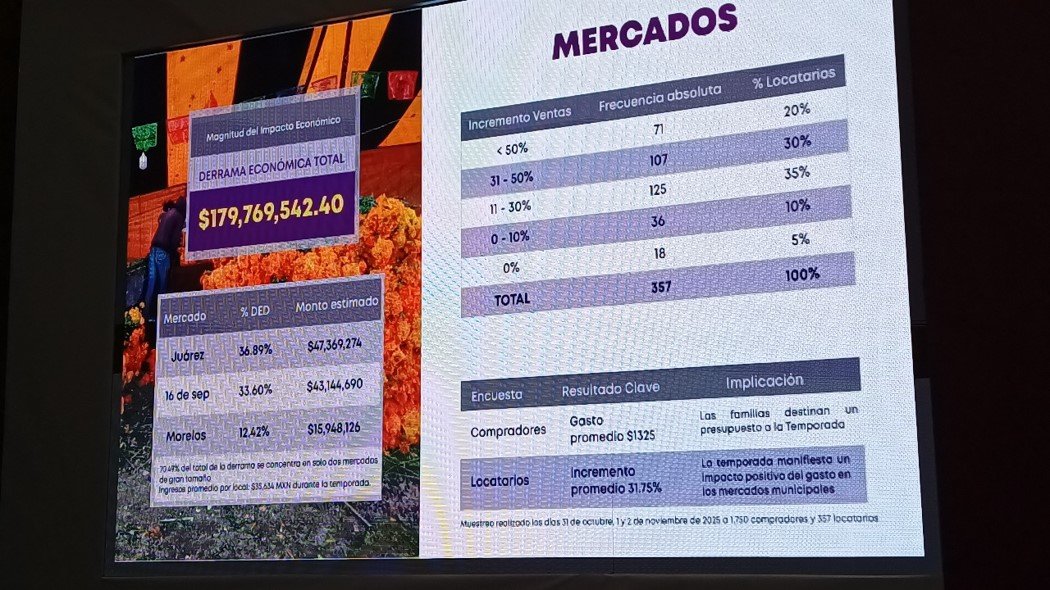 Por su parte, Yolanda Esquivel, directora de Desarrollo Económico, explicó que la derrama económica fue calculada con una metodología avalada por la Secretaría de Economía y organismos internacionales, mediante encuestas y conteos automatizados con drones. Se registró un gasto directo de más de 990 millones de pesos, beneficiando a comerciantes, hoteleros, restauranteros, alfeñiqueros, transportistas y proveedores.