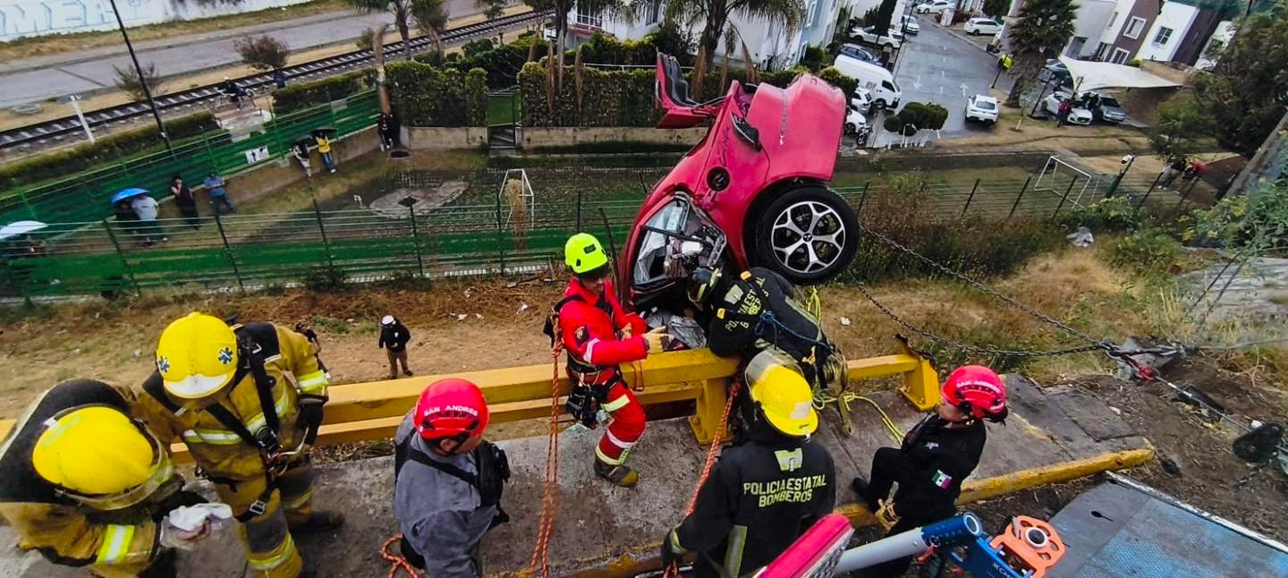 El incidente involucró a un automóvil que, por causas no detalladas oficialmente, terminó suspendido en la estructura de un puente vehicular. Dentro de la unidad se encontraban cuatro personas atrapadas, entre ellas una menor de edad, lo que requirió maniobras especializadas de rescate.