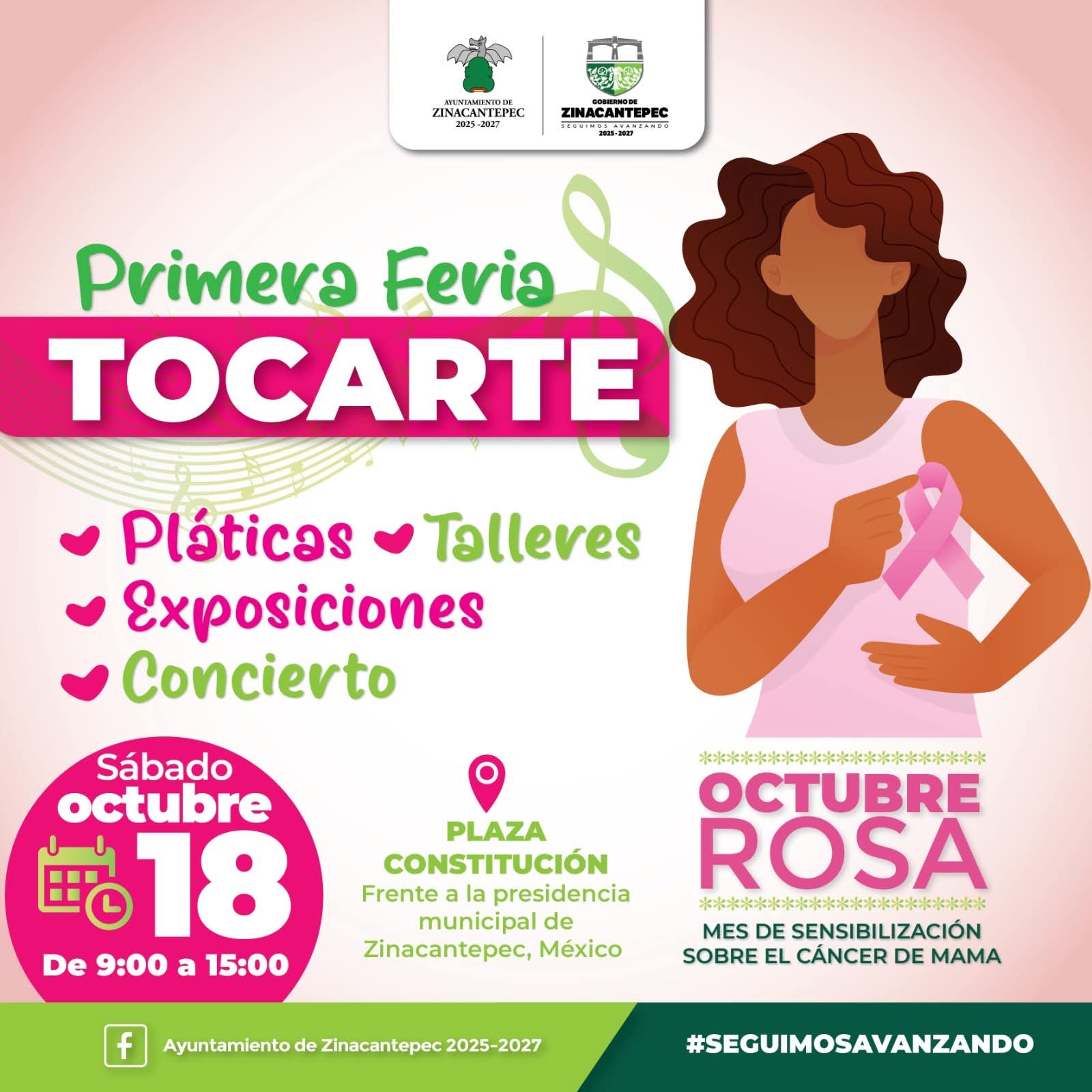 En el marco del Mes Rosa, el Ayuntamiento de Zinacantepec llevará a cabo la Primera Feria “Tocarte”, una jornada dedicada a la sensibilización y prevención del cáncer de mama.
