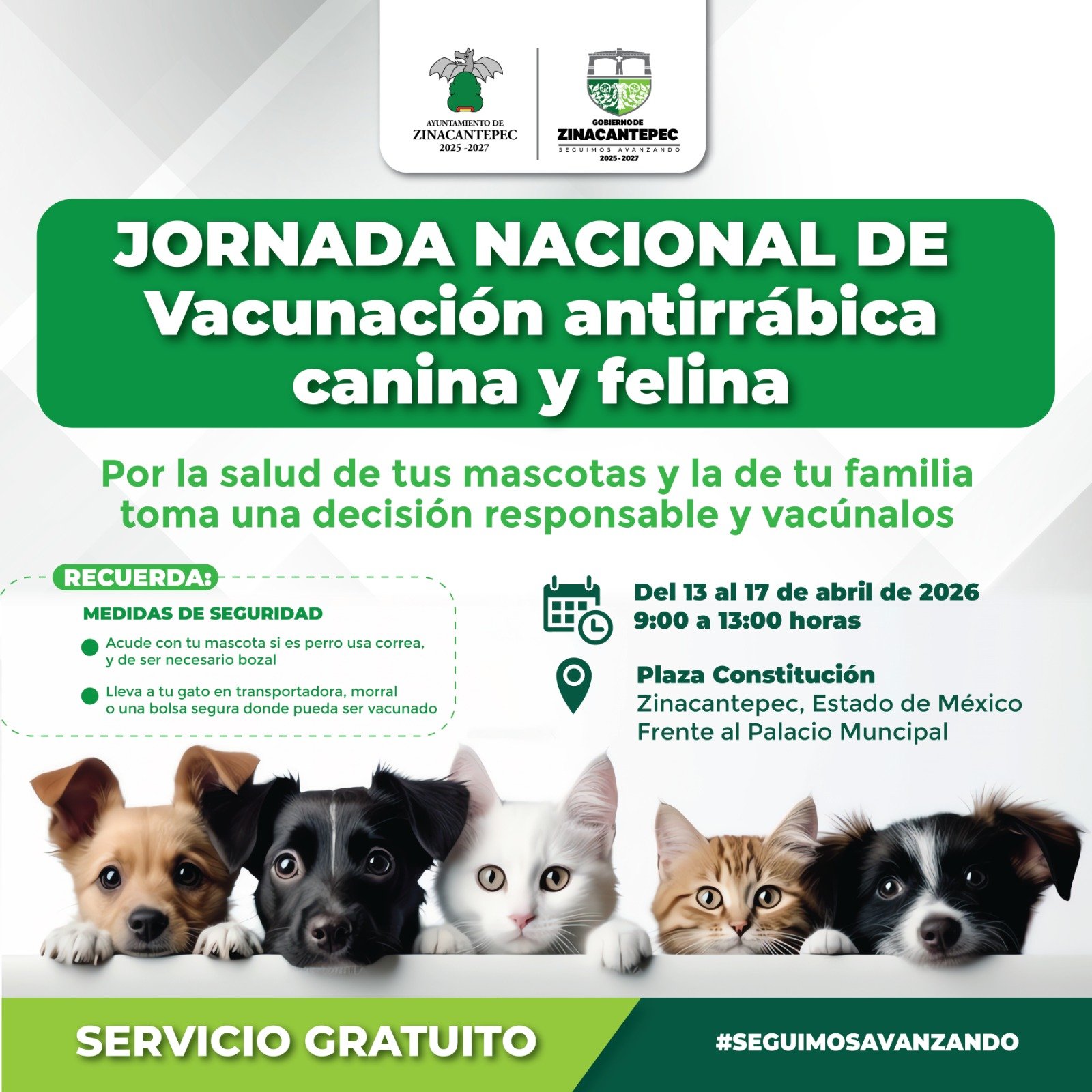 El Ayuntamiento de Zinacantepec anunció la realización de una Jornada Nacional de Vacunación Antirrábica canina y felina, con el objetivo de prevenir enfermedades y proteger tanto a las mascotas como a la población.