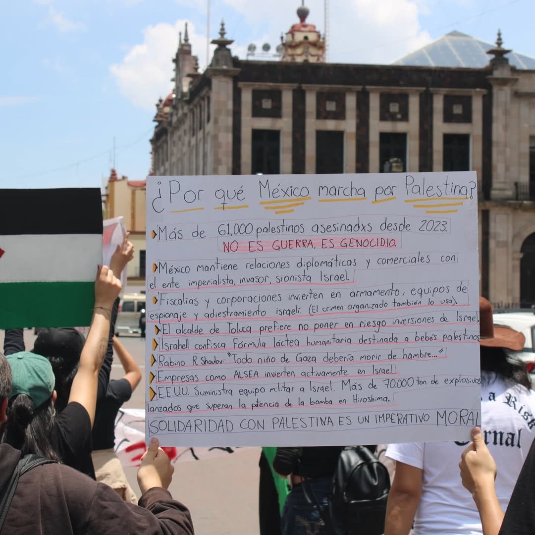 Integrantes del colectivo Palestina Libre Valle de Toluca realizaron este domingo una movilización en solidaridad con el pueblo palestino en calles de la capital mexiquense.