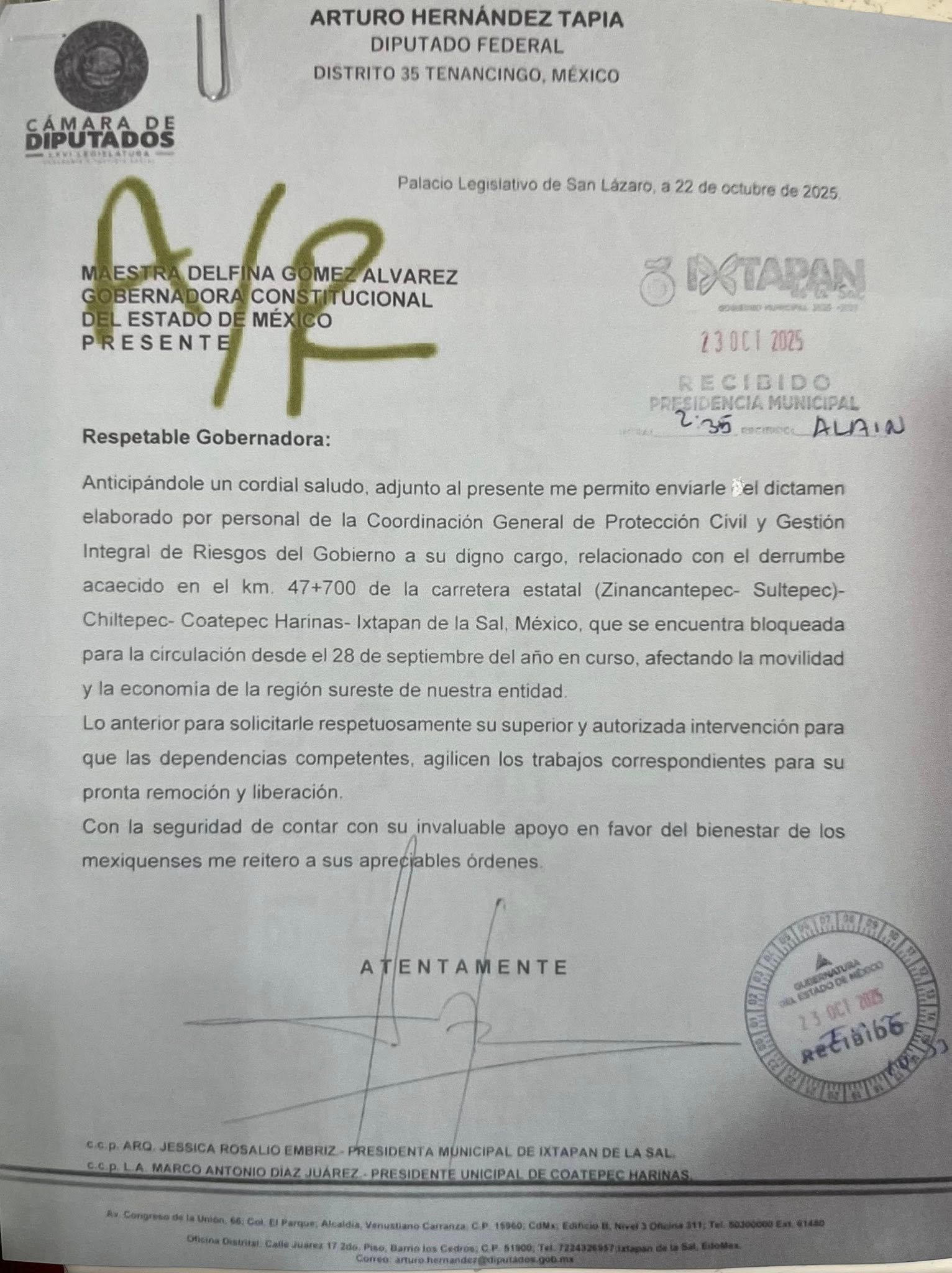 De acuerdo con el oficio, recibido oficialmente por la Presidencia Municipal de Ixtapan de la Sal el 23 de octubre, el deslave ha afectado la movilidad y la economía de la región sur del Estado de México, por lo que Hernández Tapia pidió que las dependencias estatales competentes agilicen los trabajos de remoción y liberación de la vía.