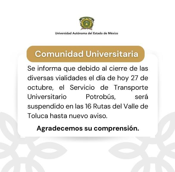 En medio del intenso caos vial provocado por protestas de dueños de pipas de agua en el Estado de México y la Ciudad de México, la Universidad Autónoma del Estado de México (UAEMéx) anunció la suspensión temporal de su servicio de transporte estudiantil en las 16 rutas que operan en el Valle de Toluca.