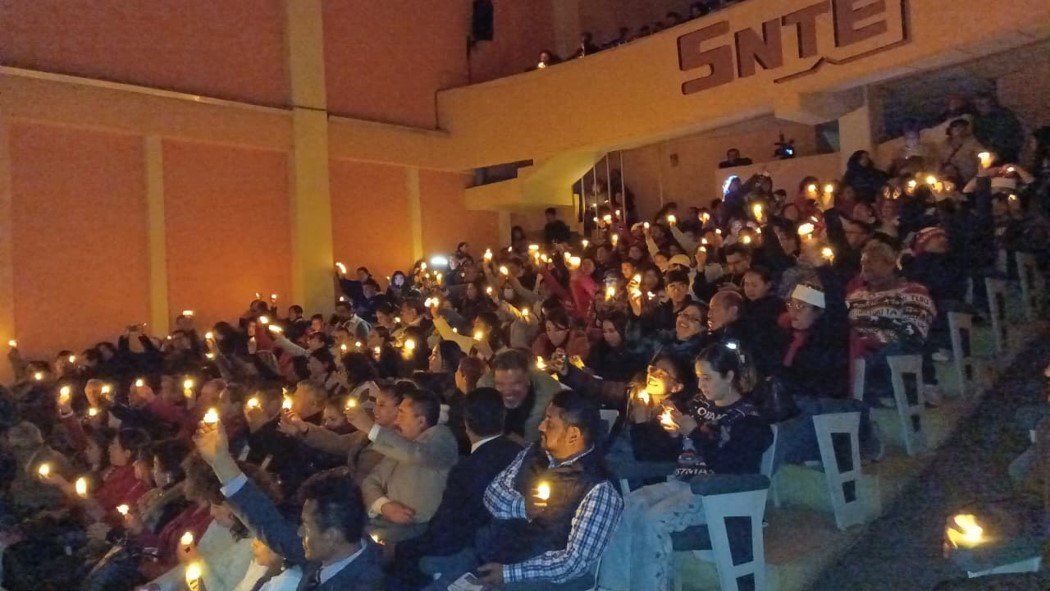 Tras el discurso, el ambiente se transformó en una blanca y linda Navidad con el encendido del árbol navideño y la colocación del tradicional Nacimiento del Niño Dios en la Unidad Cultural y Deportiva de la Sección 17. Las luces y adornos dieron color a la celebración, que reunió a docentes y sus familias en un espacio de convivencia y alegría.
