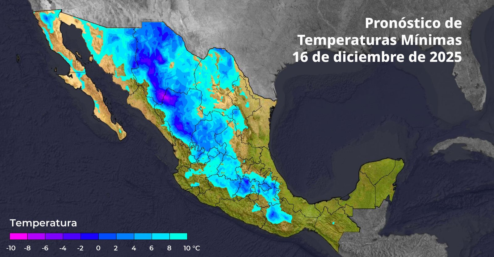 Durante las primeras horas del día se prevé un ambiente frío a muy frío en el norte, noreste y centro de México, con heladas en zonas serranas. Conforme avance la jornada, se presentará un contraste térmico, ya que en regiones del occidente y sur se esperan temperaturas más elevadas durante la tarde, mientras que en el altiplano central el ambiente se mantendrá fresco a templado.