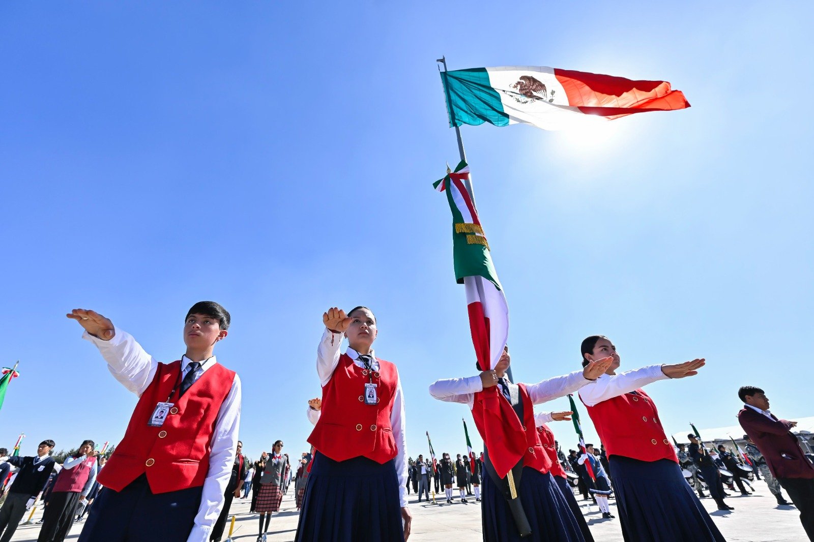 Como parte de la ceremonia, la mandataria estatal realizó el abanderamiento de 150 escoltas escolares. De acuerdo con lo informado, esta acción busca reforzar la formación cívica en una de las entidades con mayor matrícula educativa del país.