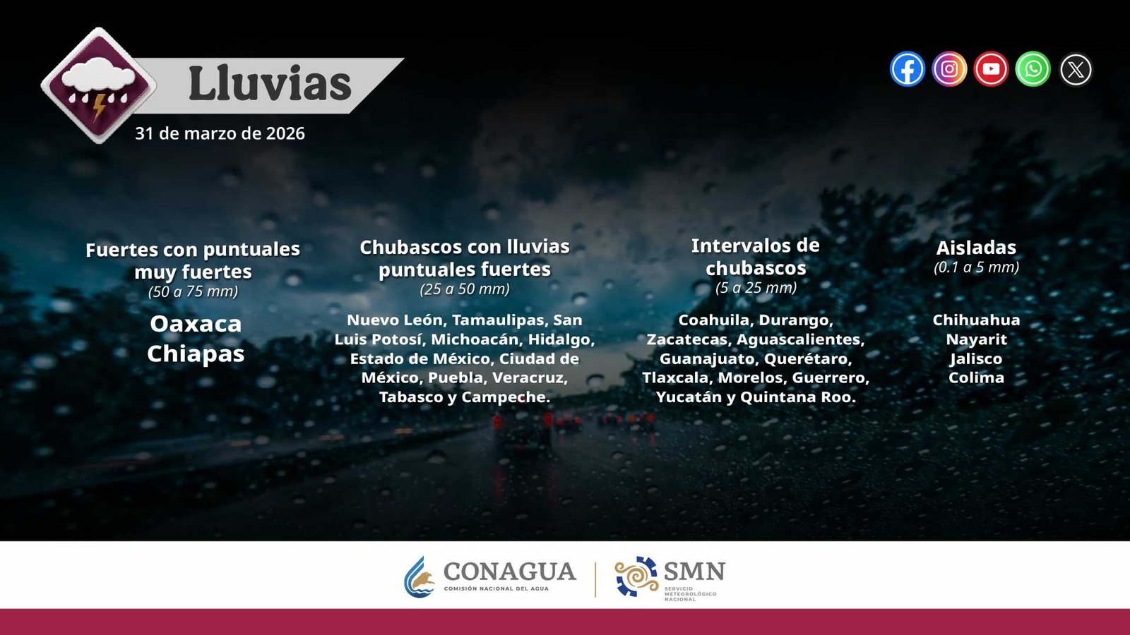 En el Estado de México y la Ciudad de México se prevén lluvias fuertes, con acumulaciones de entre 25 y 50 milímetros. Estas precipitaciones podrían presentarse acompañadas de actividad eléctrica y caída de granizo, especialmente durante la tarde y noche.