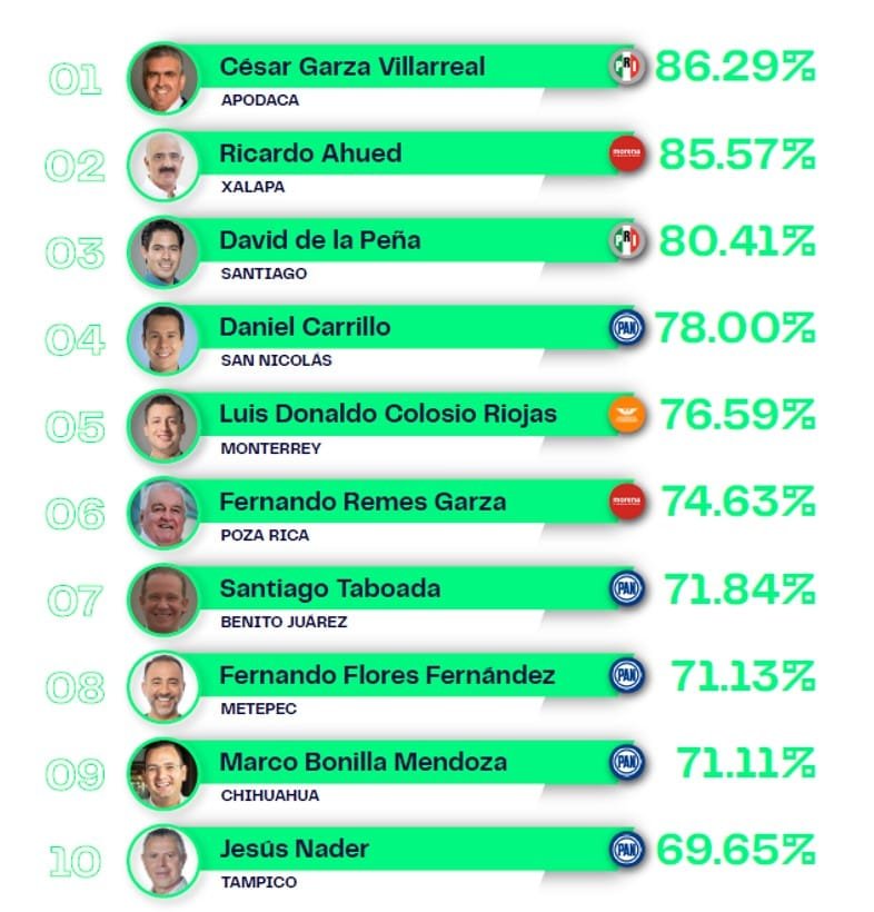 En primer lugar, con mayor aceptación de sus gobernados, se ubicó el alcalde de Apodaca, César Garza Villarreal, que alcanzó un 86.29 por ciento, es decir 15.6 puntos más que el presidente municipal de Metepec.