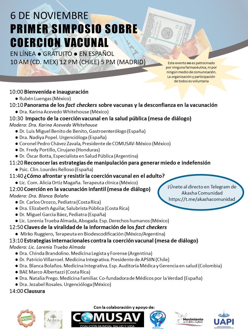 El encuentro será a través del canal de Telegram de Akasha Comunidad, colectivo encabezado por la reconocida Dra. Karina Acevedo, quien también formará parte de las mesas para discutir la coerción vacunal en la salud pública.