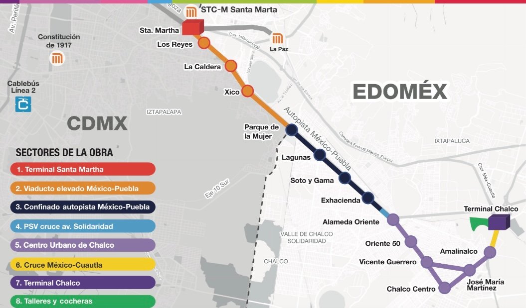 Las obras de este Trolebús, construidas en colaboración entre el gobierno del Edomex, la CdMx y el federal, ya se encuentran en marcha y se tiene programado que culminen durante el primer trimestre del 2024; la ruta conectará las terminales de Chalco y Santa Martha, y contará con 13 estaciones intermedias, cubriendo una distancia de 18.5 km.