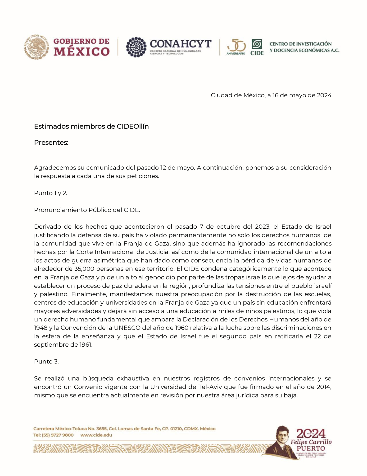 «El CIDE condena categóricamente lo que acontece en la Franja de Gaza y pide un alto al genocidio por parte de las tropas israelís que lejos de ayudar a establecer un proceso de paz duradera en la región, profundiza las tensiones entre el pueblo israelí y palestino», señaló el instituto a través de un comunicado.