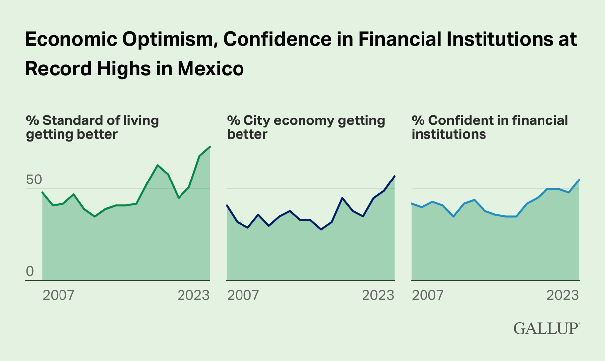 La confianza en la economía, en las instituciones financieras y en el estándar de vida, también habría alcanzado su punto más alto desde 2007, según los resultados publicados por Gallup en su reporte del día 29 de mayo del 2024.