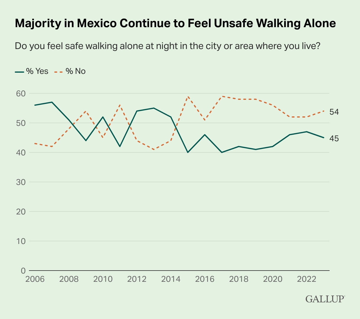 Según el más reciente sondeo de Gallup, solo el 45% de los mexicanos declararon sentirse seguros, mientras que el 54% afirmaron que no tienen tal seguridad.