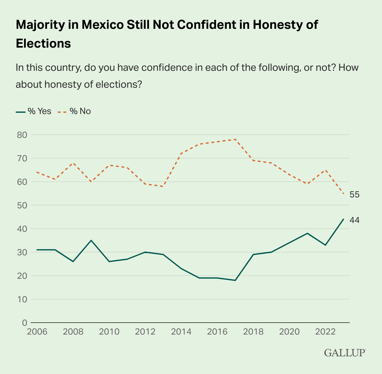 A pesar de esto, hay algunos indicadores donde todavía no existe plena confianza de la ciudadanía, tal es el caso de la honestidad en el proceso electoral, pues solamente un 44% declararon su confianza en las elecciones; no obstante que se trata también de la cifra más alta en las últimas dos décadas.