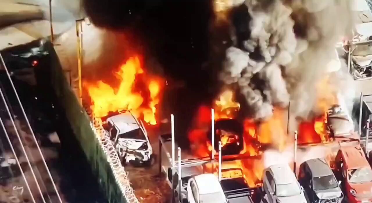 Tras el impacto se produjo una explosión inmediata que generó una bola de fuego visible a varios metros de distancia. Las llamas alcanzaron al menos siete vehículos en circulación y se propagaron hacia un estacionamiento cercano, donde más de 50 automóviles y tres camiones resultaron incendiados. También se reportaron daños en maquinaria ferroviaria ubicada en las inmediaciones.