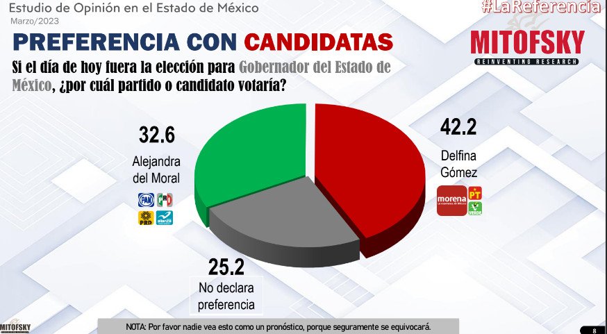 A la pregunta de «si el día de hoy fuera la elección para gobernador del Estado de México, ¿por cual partido o candidato votaría?, Delfina Gómez de la coalición Morena-PT-PVEM, reportó un 42.2% de las preferencias; casi 10 puntos por delante de la virtual candidata del PAN-PRI-PRD-Panal, Alejandra del Moral.