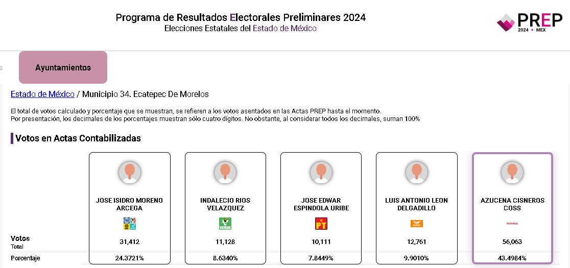 Con un 16.5% de avance en el conteo del Programa de Resultados Preliminares (PREP), Azucena Cisneros tiene una amplia ventaja en el proceso rumbo a la presidencia municipal de Ecatepec.