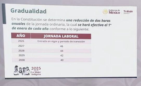 El 3 de diciembre de 2025, la presidenta Claudia Sheinbaum envió al Congreso de la Unión una iniciativa para modificar el artículo 123 constitucional y la Ley Federal del Trabajo, con el fin de disminuir gradualmente la jornada semanal máxima de 48 a 40 horas. El calendario planteado establece reducciones anuales: