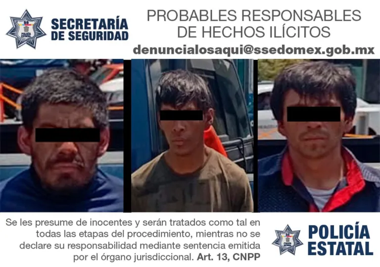 Al concluir las acciones operativas, se llevó a cabo la aprehensión de Víctor “N”, Luis “N” y Enrique “N” de 39, 29 y 21 años de edad, respectivamente, a quienes les decomisaron una réplica de arma de fuego. También se aseguró una tapa de herrería, una barreta, un martillo y once tubos metálicos tipo PTR.