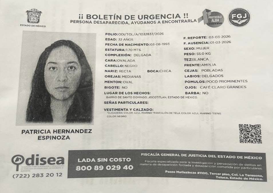El cuerpo sin vida de Patricia, de 32 años de edad, fue localizado en un predio del municipio de Jocotitlán, Estado de México, luego de que contaba con una ficha de búsqueda activa desde el pasado 1 de marzo.