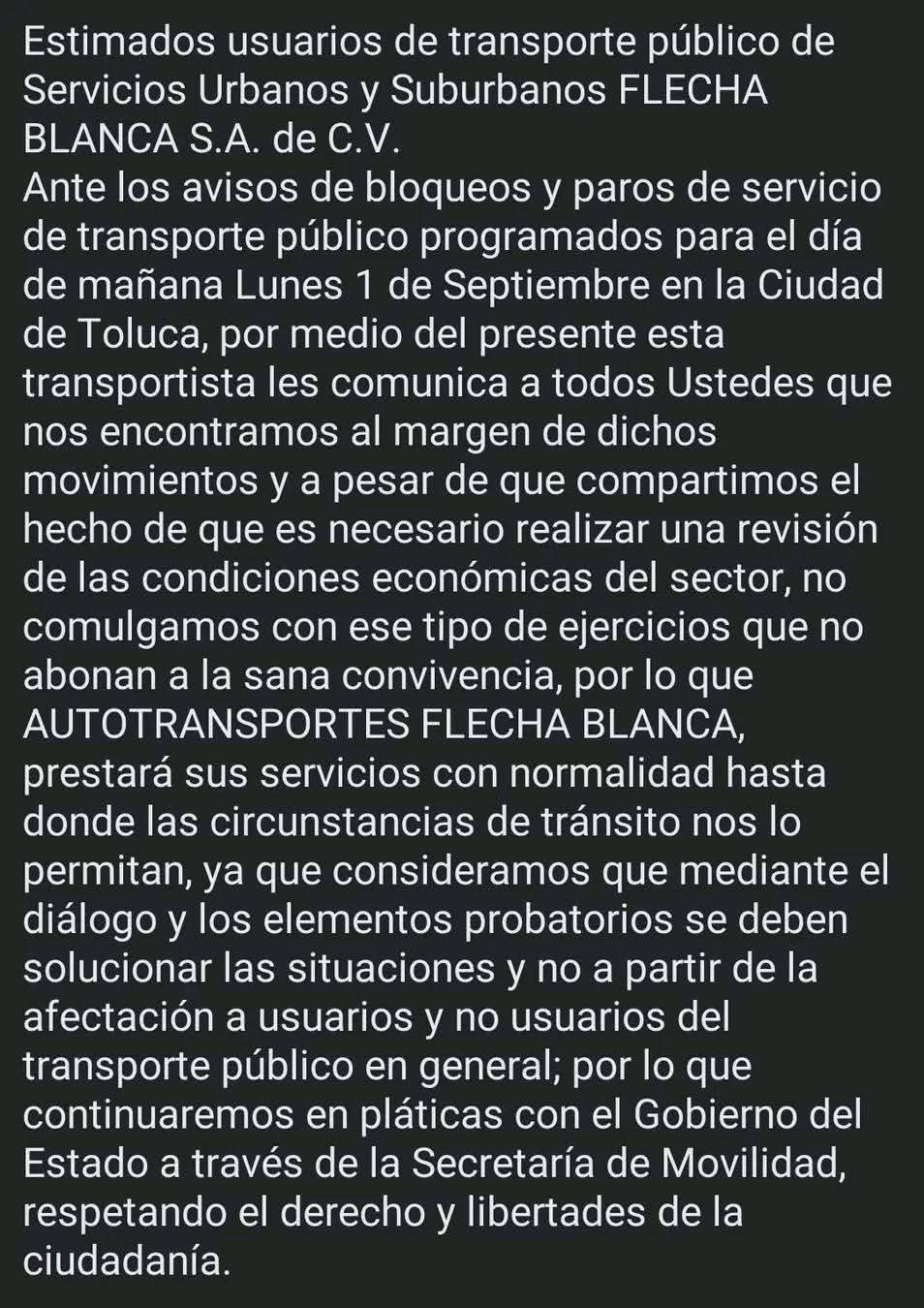 Tanto la línea Xinantecatl como la empresa de Transporte Urbano y Suburbano Flecha Blanca señalaron que prestarán el servicio de manera normal, en la medida en que las condiciones de tránsito lo permitan.