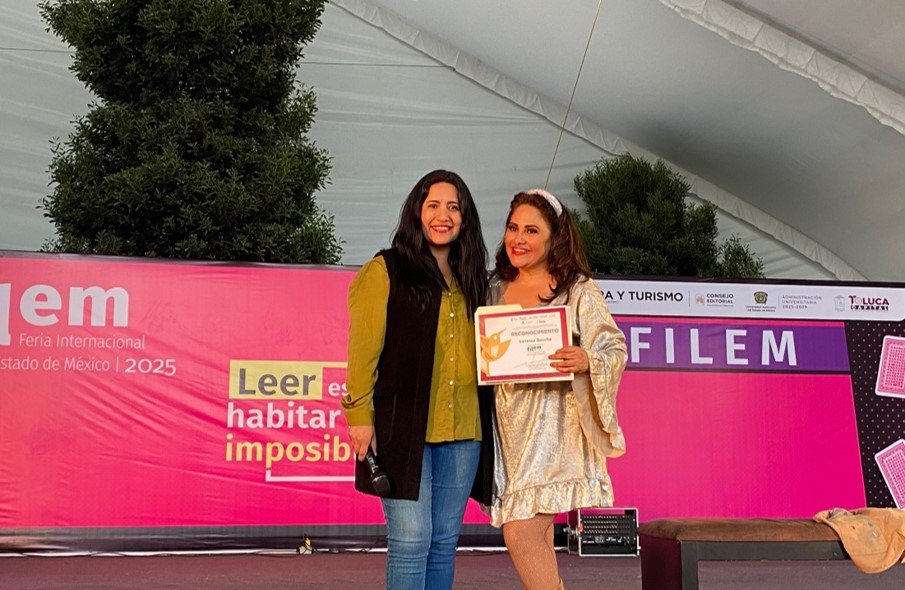 Toluca, Edoméx.- La secretaria de Cultura del Estado de México, Nelly Carrasco, entregó un reconocimiento a la actriz Vanessa Vauche por su trayectoria y por su producción de “La Insignificancia de llamarse Juana” que el día hoy se presentó en la Plaza de los Mártires de la Capital Mexiquense en el marco de la Feria Internacional del Libro del Estado de México (FILEM 2025).