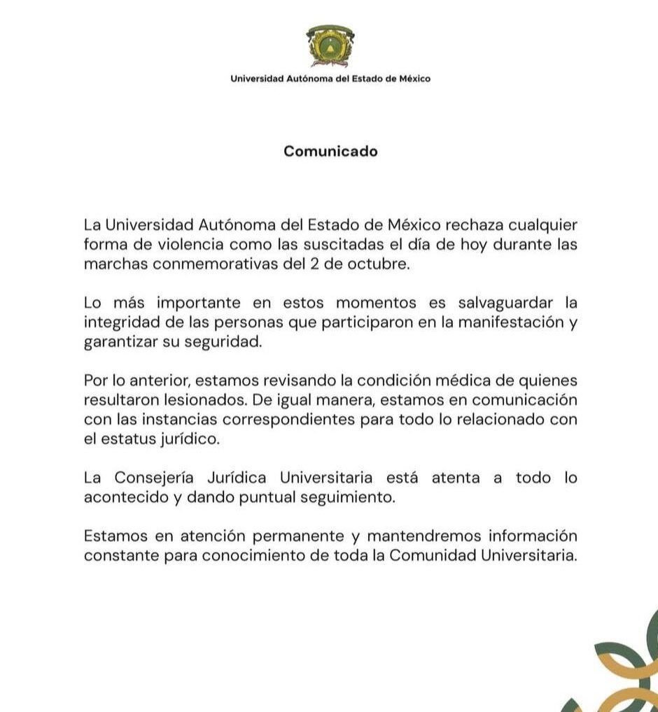 Cabe señalar que minutos antes la UAEMÉX emitió un breve comunicado condenando los hechos de violencia y señalando también que iba a aportar acompañamiento jurídico a los estudiantes.