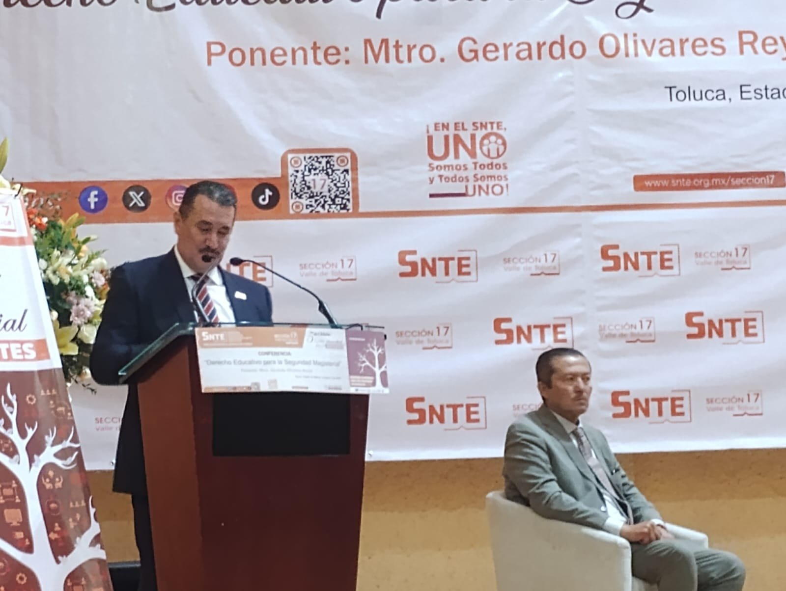 Antes de iniciar la conferencia magistral sobre «El Derecho Educativo para la Seguridad Magisterial», el líder magisterial destacó que el Mtro. Gerardo Olivares Reyes hablaría sobre los derechos que deben tener las y los maestros en el Valle de Toluca.