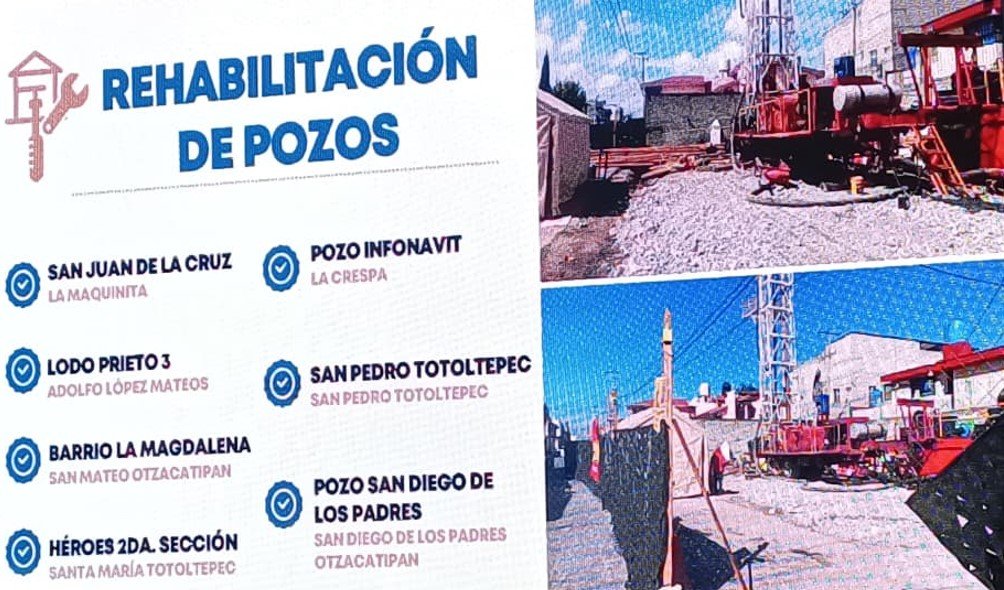 Uno de los rubros más relevantes es el de agua potable y saneamiento, donde se perforan nuevos pozos en San Diego de los Padres, Carlos Hank González, La Estación y La Normal, además de la rehabilitación de tanques de distribución como Zopilocalco, El Calvario y San Miguel. También se rehabilitan siete pozos adicionales y se ejecutan obras de drenaje sanitario y canalización pluvial en San José Guadalupe Otzacatipan y Jicaltepec Autopan. A ello se suma la rehabilitación de la planta de tratamiento del Rastro Municipal, con un avance del 40%, que atiende una alerta sanitaria. Estas acciones buscan garantizar el acceso al agua y mejorar la calidad de los servicios básicos en las diferentes colonias del municipio.