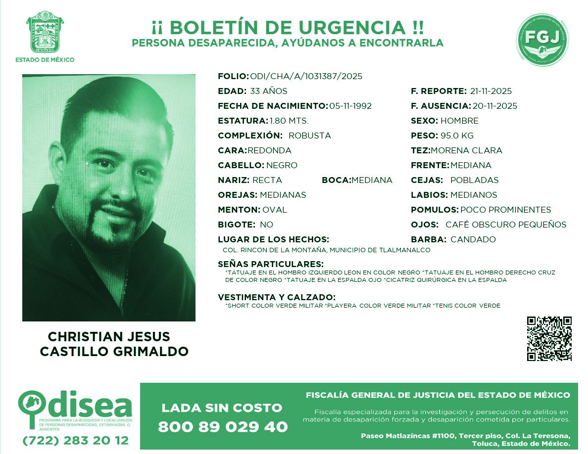 La Fiscalía General de Justicia del Estado de México (FGJEM) emitió este 21 de noviembre de 2025 una alerta urgente por la desaparición de Christian Jesús Castillo Grimaldo, sexto regidor del Ayuntamiento de Chalco por el Partido Verde Ecologista de México (PVEM). De acuerdo con el folio ODI/CHA/A/1031387/2025, el funcionario fue visto por última vez el 20 de noviembre de 2025 en el municipio de Tlalmanalco.