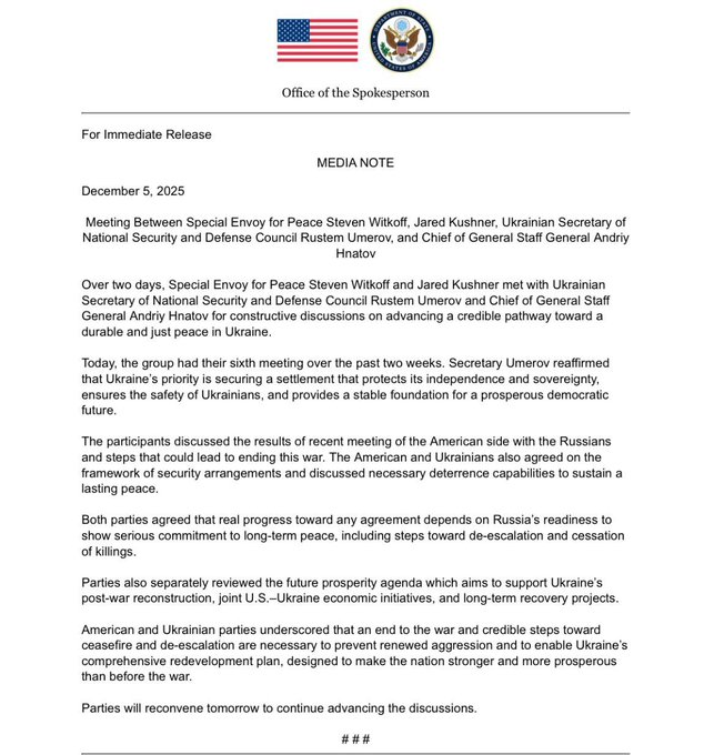 Esta comitiva viajó a Miami, donde han iniciado una serie de diálogos con su contraparte estadounidense. Estas conversaciones se iniciaron desde el día de ayer; no obstante, finalmente este viernes se emitió un comunicado conjunto idéntico, tanto estadounidense como ucraniano, confirmando estos diálogos, que se trata también de la sexta reunión en las últimas dos semanas y donde se están discutiendo los pasos que podrían conducir al fin de la guerra.