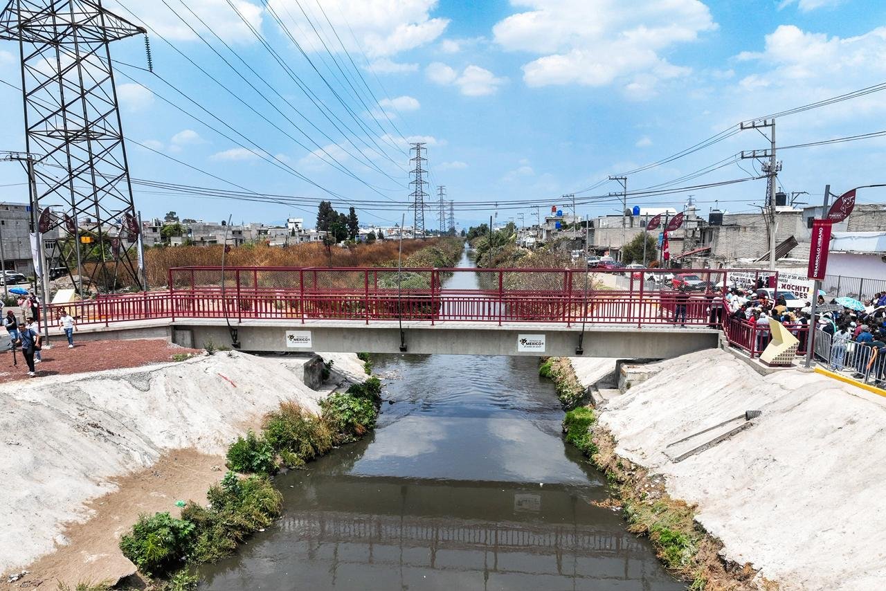 El nuevo puente peatonal se ubica sobre el Canal de La Compañía y conecta directamente a las colonias Ejidos de San Agustín, en Nezahualcóyotl, con la colonia Israel, en Chimalhuacán.