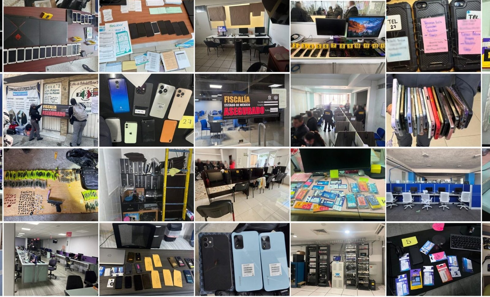 Durante la operación se aseguraron diversos bienes que presuntamente eran utilizados para la comisión de los delitos. Entre ellos se encuentran equipos de cómputo, servidores, teléfonos celulares, tarjetas SIM, terminales bancarias y documentación con datos personales y financieros. También se identificaron bases de datos que podrían contener información de potenciales víctimas.