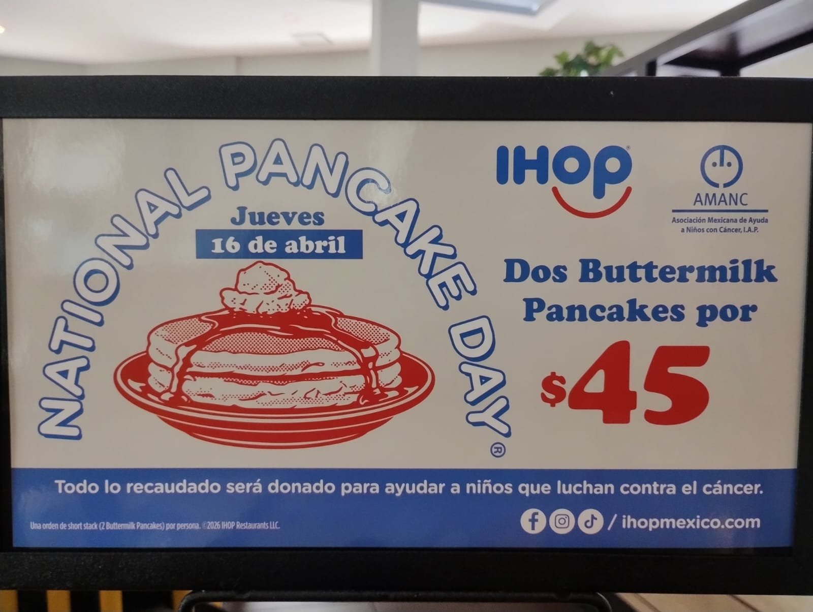 Con motivo del National Pancake Day, el restaurante IHOP llevará a cabo una venta con causa el próximo 16 de abril de 2026 en sus cuatro sucursales del Estado de México: Mundo E, Atizapán, Satélite y Metepec.